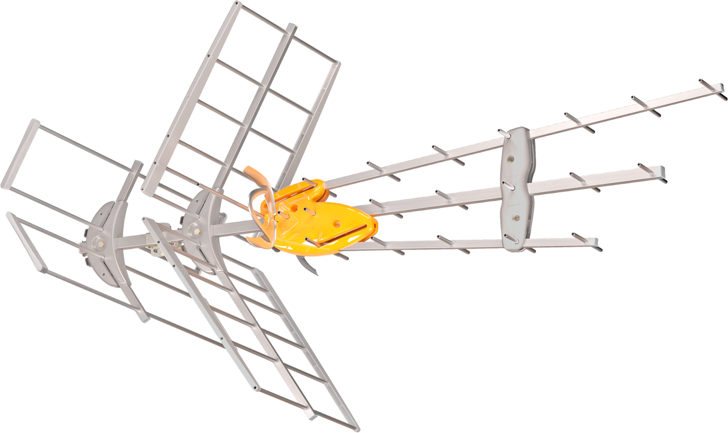 • Dzięki direktorom, rozmieszczonym synfazowo pod kątem w trzech rzędach (Yagi), antena otrzymuje najlepszy zysk, wysoką kierunkowość i doskonale zrównoważoną szerokość pasma pomiędzy niskimi i wysokimi częstotliwościami. Dzięki temu, antena anuluje moc w płaszczyźnie pionowej promieniowania.