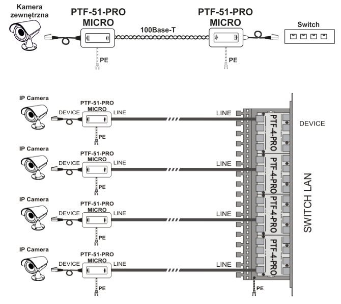 - Zabezpiecza linie sygnałowe i zasilanie PoE